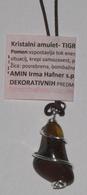 Prodajni komplet: kristalček Tigrovo oko oviti v posrebreno žičko z bombažno povoščeno vrvico, mošnjiček iz velurja z ročno izdelanimi dekorativni šivi.