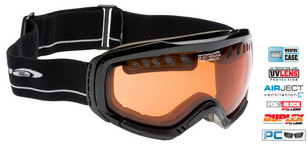 Vrhunska smučarska očala Goggle, okvir črne barve, stekla oranžne barve, kategorija zatemnitve S2. Očala imajo dvojno steklo (duplex lens tehnologija), zaščito proti rošenju (FOG block G-lens) in AIR JECT ventilation tehnologijo, ki zraku omogoča kroženje med obema plastema stekl.