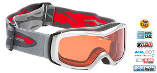 Otroška smučarska očala Goggle, okvir srebrne barve, stekla oranžne barve, kategorija zatemnitve S2. Očala imajo zaščito proti rošenju (FOG block G-lens) in AIR JECT ventilation tehnologijo, ki zraku omogoča kroženje.